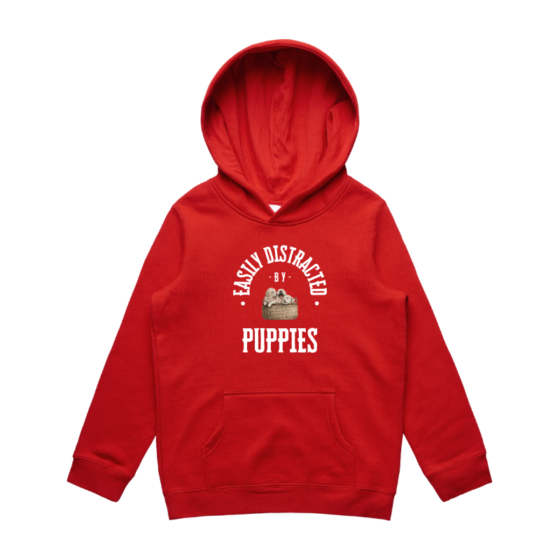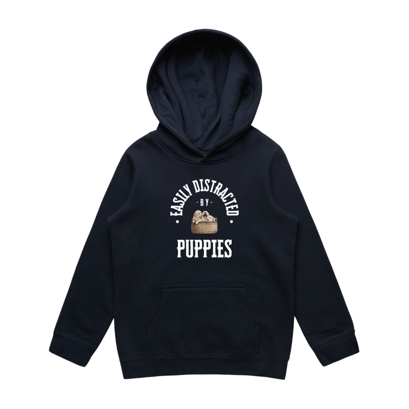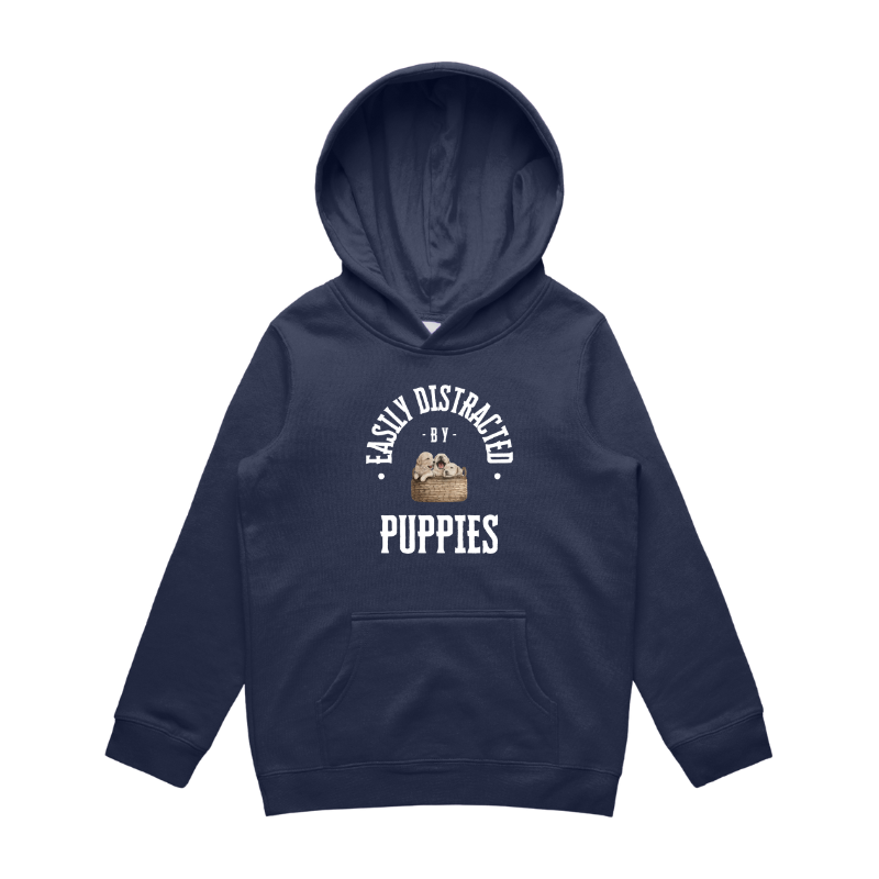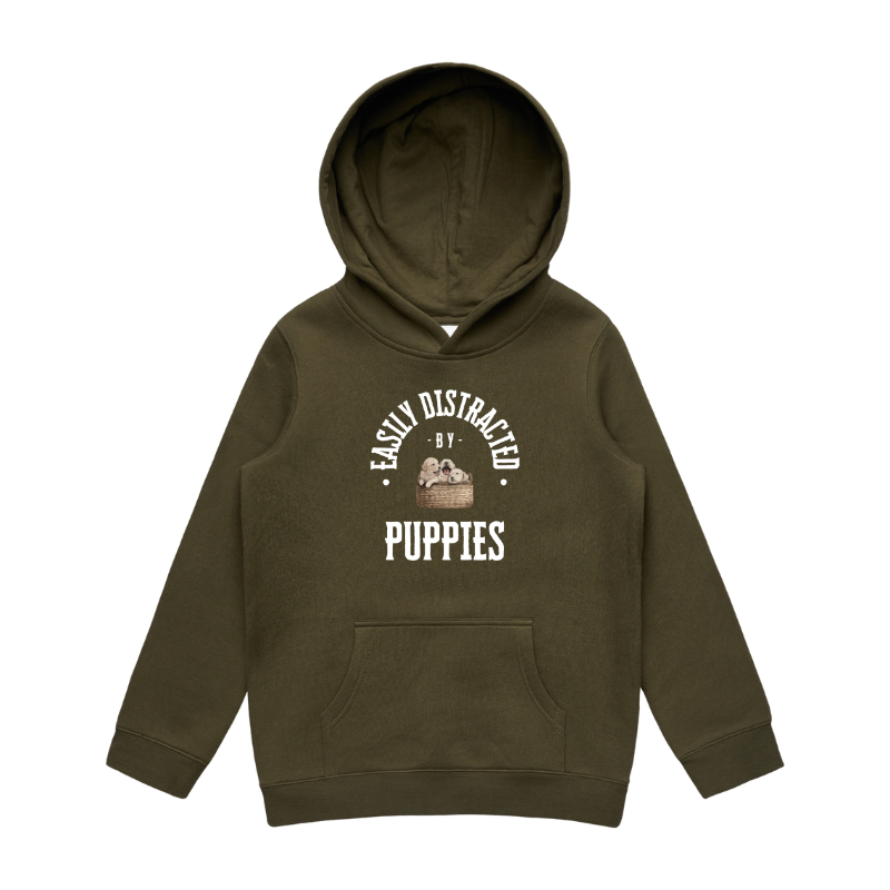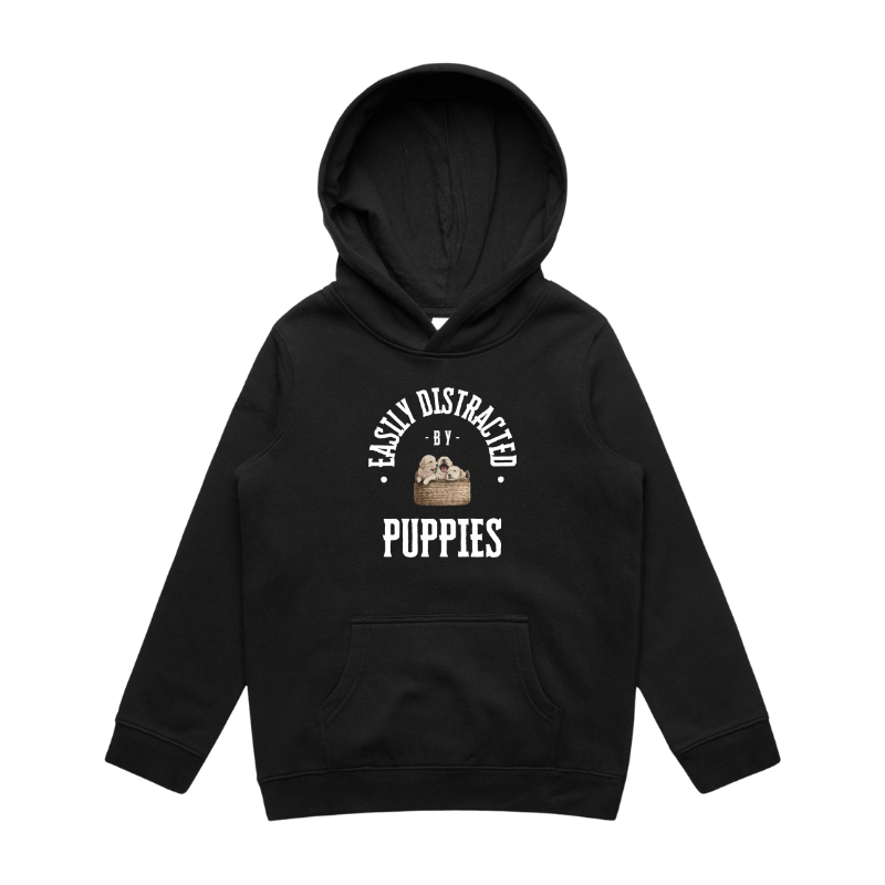 Let your little one showcase their love for adorable puppies with our charming “Distracted by Puppies” kids’ hoodie!