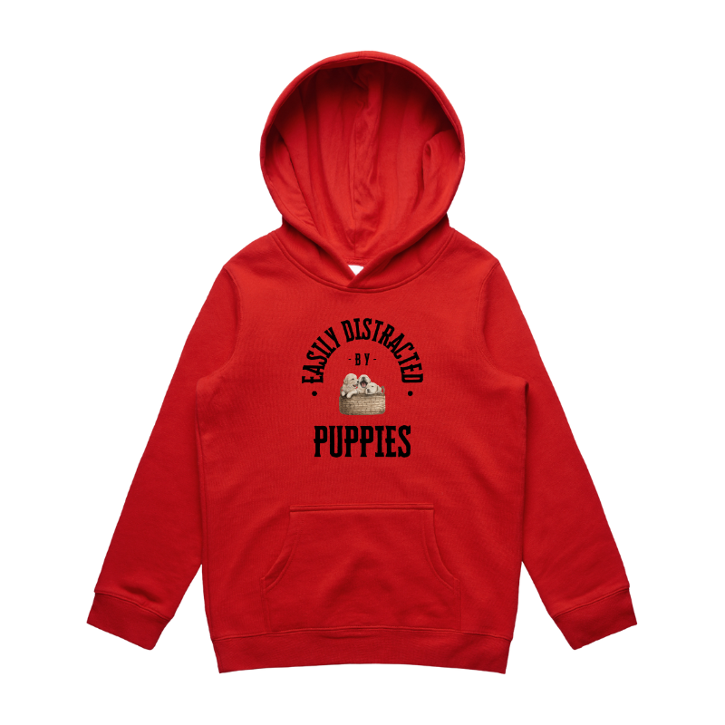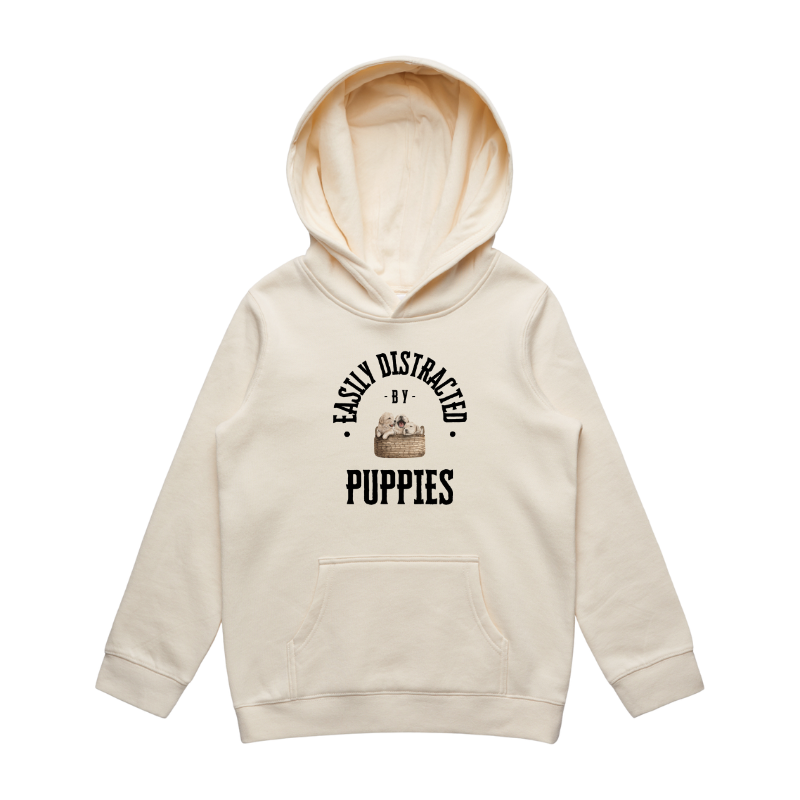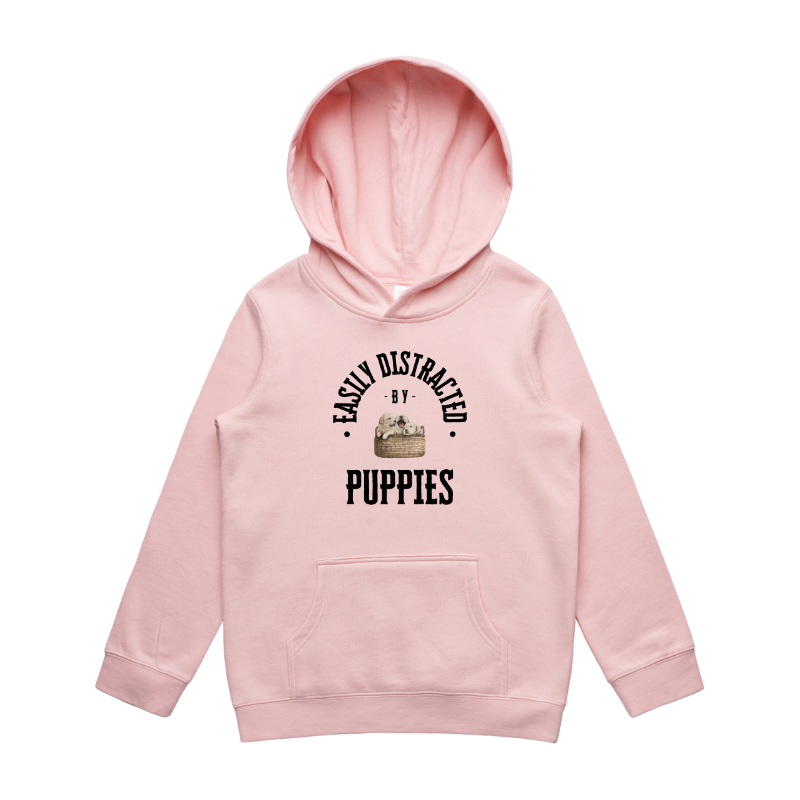 Let your little one showcase their love for adorable puppies with our charming “Distracted by Puppies” kids’ hoodie!