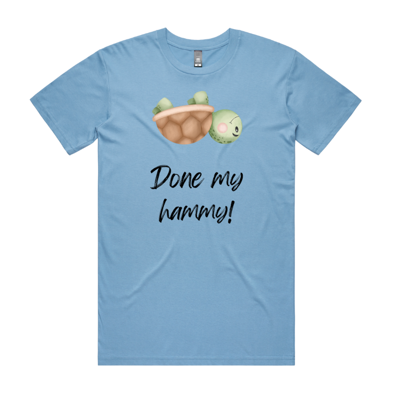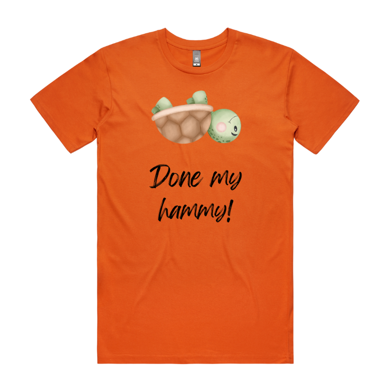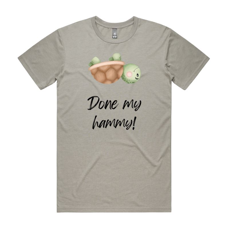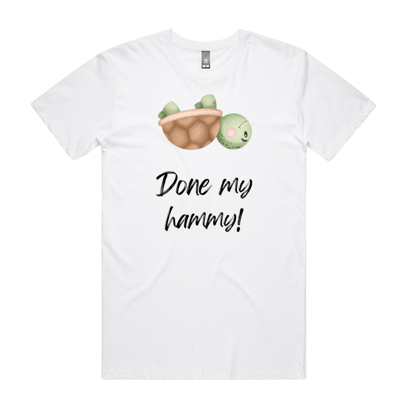 Bring a splash of humour to your wardrobe with our “Done My Hammy Turtle” t-shirt! This whimsical design features a turtle grappling with a torn hamstring, delivering a dose of charm and wit.